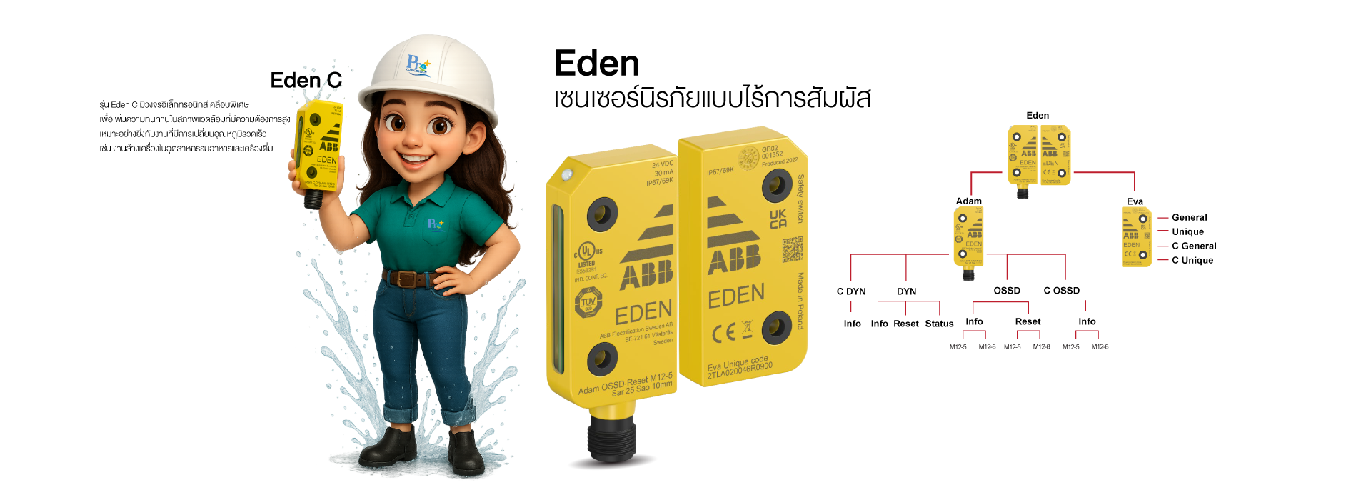 ABB Safety Eden เป็นระบบเซนเซอร์นิรภัยไร้การสัมผัส ใช้คู่เซนเซอร์-แอคทูเอเตอร์เพื่อตรวจจับประตูหรือฝาครอบเครื่องจักร ปลอดภัยระดับสูงตามมาตรฐาน ISO/IEC ลดการเดินสายด้วยการสื่อสารแบบ non-contact ทนฝุ่น ความชื้น และการสั่น ช่วยลด downtime มีการวินิจฉัยผ่านสัญญาณ LED/สื่อสาร สนับสนุนการติดตั้งยืดหยุ่นและบำรุงรักษาง่าย ประหยัดพื้นที่และต้นทุน รวมถึงการใช้งานกับระบบควบคุมความปลอดภัยหลากหลาย ทำงานเสถียรแม้สภาพแวดล้อมหนัก